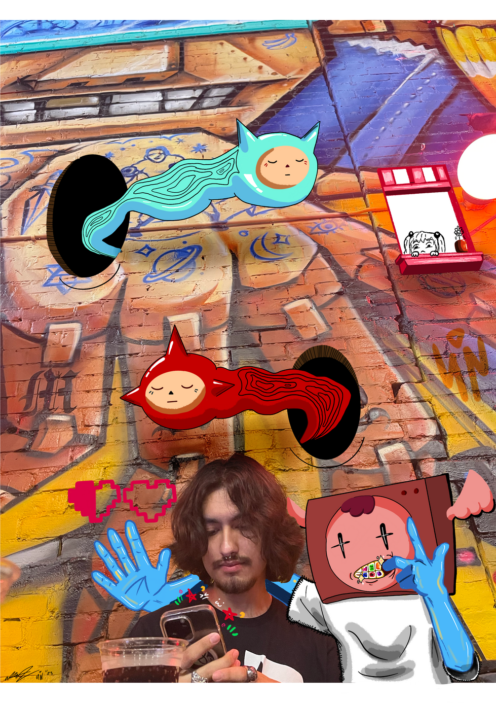 A series of vibrant and imaginative illustrations featuring anime-style characters in various urban settings.